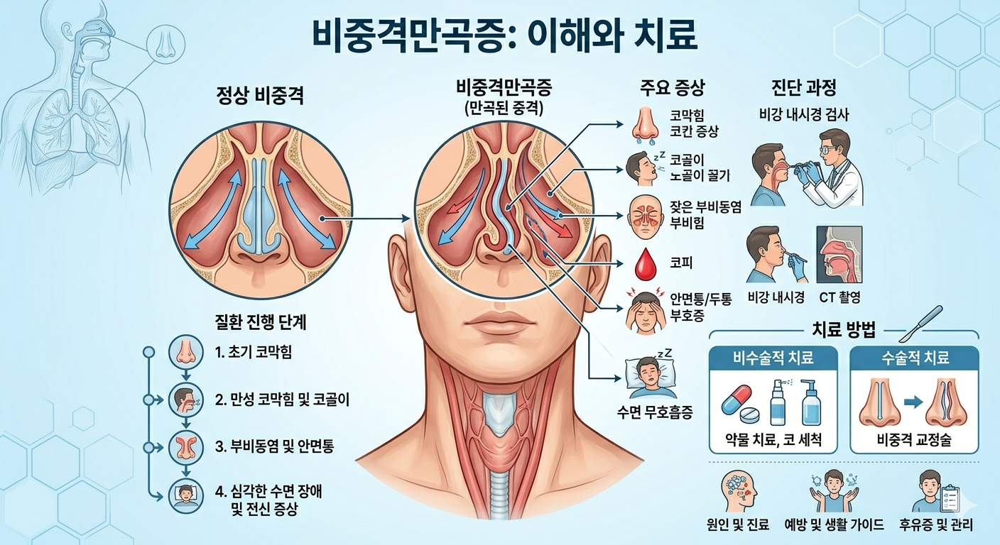 밤마다 입을 벌리고 자다 아침에 목이 타들어 가는 느낌, 한 번쯤 겪어 보셨을 겁니다. 단순 건조함이나 비염 탓이라고 넘기기 쉽지만, 비중격 만곡증이 원인인 경우가 생각보다 꽤 많습니다. 병동에서 수많은 환자를 곁에서 지켜보며 느낀 건, 이 질환은 '참을 만하다'는 착각 속에서 너무 오래 방치된다는 점입니다.